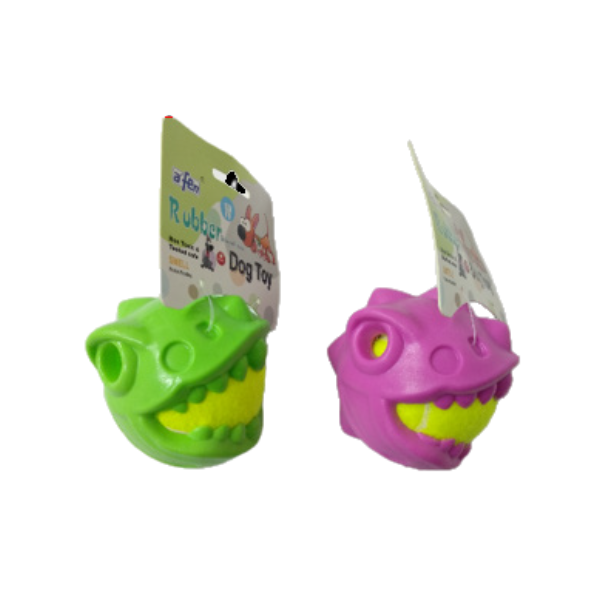 צעצוע לכלבים בצורת דינוזאור העשוי מחומר גומי, עם כדור טניס מובנה בפנים ומצפצף